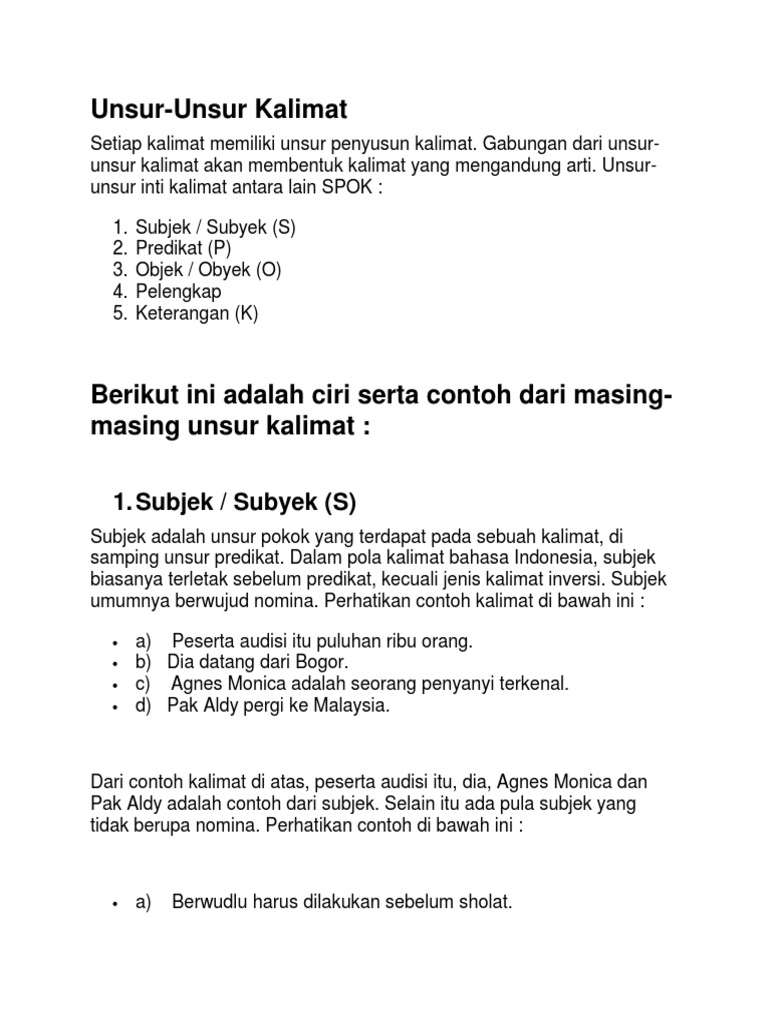 Pengertian kalimat adalah gabungan dari dua kata atau lebih yang menghasilkan suatu pengertian dan menggunakan pola intonasi akhir. Dalam bahasa indonesia, kita mengenal istilah kalimat. Sedangkan 2 kalimat atau lebih yang tidak memakai konjungsi bertingkat bisa digabungkan dengan tanda titik koma atau tanda koma. Oleh karenanya, pola kalimat ini dirasa penting agar tidak terjadi kesalahpahaman dengan penyusunan kata yang sesuai pola kalimat tadi. Kalimat spok adalah rangkaian kata yang mengandung subjek (s), predikat (p), objek (o), dan keterangan (k). Pengertian kalimat simpleks adalah kalimat dengan jumlah 1 kata verba atau predikat saja. Pola kalimat ini adalah pola yang mengandung semua unsur kalimat dalam bahasa indonesia, yaitu subjek, predikat, objek, pelengkap, dan deskripsi. Kalimat dasar berpola spok (subjek + predikat + objek + keterangan) contoh kalimat: Berikut kakak akan mencoba menjawab pertanyaan tersebut. Berikut ini akan ditampilkan contoh kalimat simpleks baik dengan pola s p s p o s p k dan s p o k contoh kalimat berpola spok ilmusosial id. Kalimat majemuk ini terdiri dari suatu induk kalimat dan dengan perkataan lain, semua kalimat yang kita gunakan berasal dari beberapa sebuah pola kalimat dasar saja. Kalimat simpleks ini hampir sama dengan kalimat majemuk karena terdiri kalimat induk atau klausa utama dan kalimat anak atau klausa penghubung. 4.2.contoh kalimat simpleks dengan pola kata benda.
